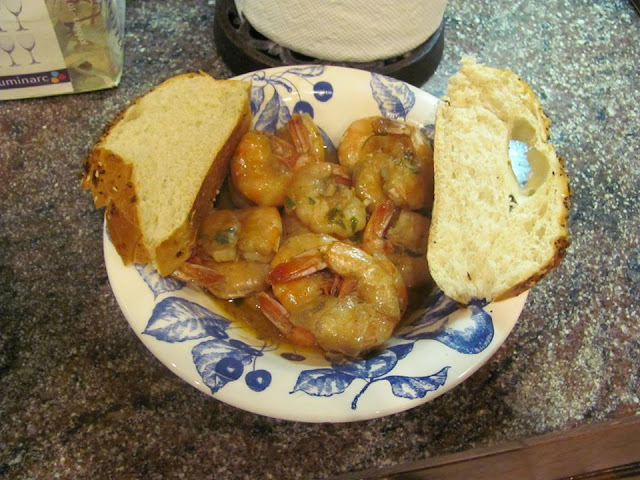 I decided to make a special treat for my daughter's birthday. She loves shrimp cooked with a little garlic but I decided to kick the recipe up a few notches. New Orleans style "barbecue" shrimp has nothing to do with an outdoor grill (although you nothing is stopping you from putting your pan on the grill). For this recipe, you want shrimp with the shells and even heads still on. There is something the shells do to the sauce. It seems to make the butter sauce emulsify and creates a great flavor. I snipped some rosemary from my garden and added some Worcestershire sauce and hot sauce. This sauce is also delicious for cooking any white fish like catfish or tilapia and it is also good with chicken.